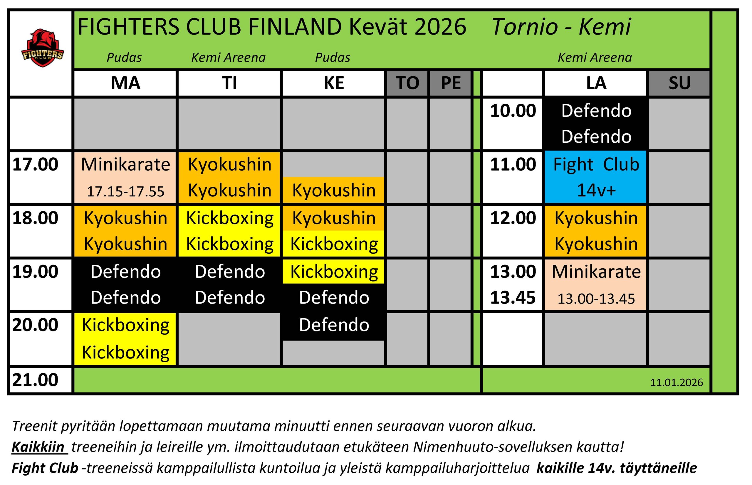Kemin päässä päätettiin tehdä pienet hienosäädöt aikatauluihin viikonloppujen osalta. Nyt kaikki treenit lauantaisin. Jatkossa tunti Defendoa, sen jälkeen tunnin FightClub-treenit (eli käytännössä useimmiten kaikille kickboxingia, mutta välillä myös pienryhmissä oman lajin treeniä). Sen jälkeen vuorossa karatet, saadaan Minikaraten 6-9v. aloitus myös Kemiin – 31.1.2026 alkaa ! Kyokushinkaraten Peruskurssi 10-14 vuotiaille taas alkaa 20.1. Kemissä